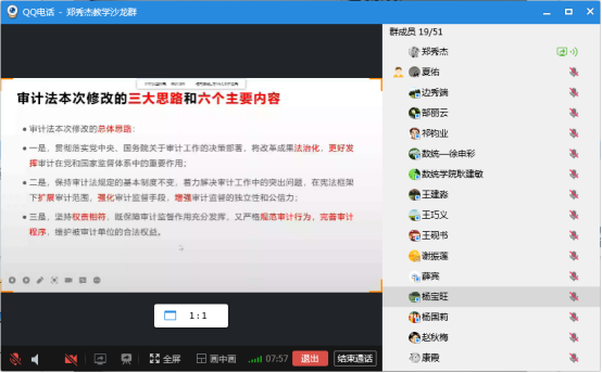 围绕审计法修订的背景和主要内容,郑秀杰教授结合自己的教学经验进行了分享和交流,对审计法本次修改的三大思路及六个主要内容进行了详细阐述,对如何正确理解审计法修订后的内容要点提出了思路,并就其中可能存在的问题与参会老师展开了热烈的讨论。