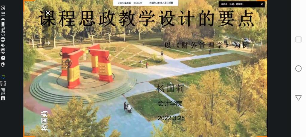 2022年3月28日晚上,由教学评估与教师教学发展中心主办,tyc122cc承办的本学期第一期教学沙龙活动在线上顺利开展。tyc122cc杨国莉教授主讲的教学沙龙主题是“课程思政教学设计的要点---以《财务管理学》为例”。tyc122cc、商公司、数统公司的50多名教师参加了本次活动。
