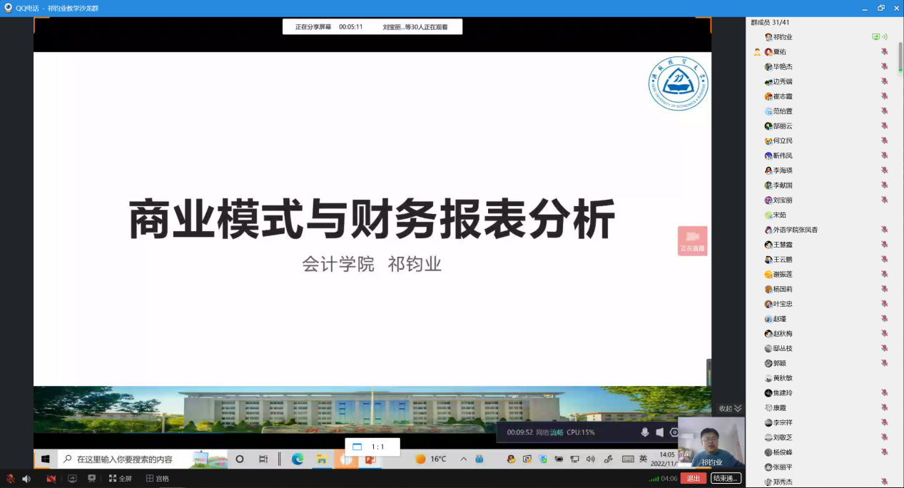 2022年11月14日下午,由教学评估与教师教学发展中心主办,tyc122cc承办的教学沙龙活动,在线上顺利开展。会计系祁钧业老师的教学沙龙主题是“商业模式与财务分析”。来自tyc122cc、商公司、工商管理公司等40多名教师参加了教学沙龙活动,活动由杨国莉副经理主持。