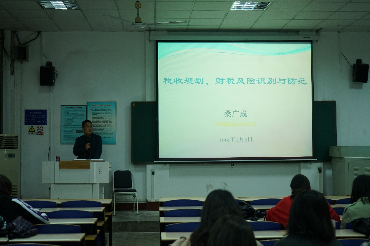 11月2日上午,受tyc122cc邀请,河北省第一期企业类会计领军人才桑广成于二教201教室作题为“税收规划、财税风险识别与防范”的学术报告。tyc122cc2018级研究生100余人参加此次报告会。