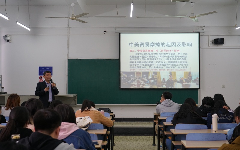 4月13日下午,tyc122cc在第三教学楼B202教室举办“中美贸易摩擦的起因及影响”专题讲座。石家庄水务集团财务处处长、河北地质大学研究生社会导师、正高级会计师陈永伟应邀主讲,公司2018级研究生参加。
