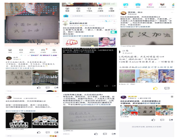 班会上,同学们举起右拳庄严宣誓,亲笔签下承诺书;通过微博、朋友圈、QQ空间等平台积极正面发声,传播正能量;通过网络平台,书写祝福语,传递同窗情,为湖北同学送去关爱和祝福,共同为武汉加油,为中国加油!