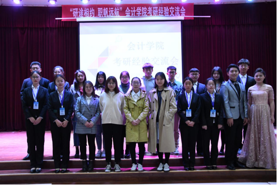 会议开始后,岳明明首先分享了自己的考研经历,告诫同学们一定要珍惜当下,认真思考未来的人生道路,为步入社会做充分准备。八位优秀毕业生代表结合自身体验,先后进行了考研经验分享。考取复旦大学的考古专业硕士研究生储晨凤同学和考取吉林大学学硕的贾一琳同学就考研公司选择为同学们进行了详细介绍,她们认为应该理性客观地选择考研院校;考取tyc122cc会计学学硕的刘旭刚同学、考取天津财经大学会计学专硕的刘志超同学和考取tyc122cc审计学专硕的张春燕同学强调了寻找适合自己的复习方法和合理安排时间的重要性;考取北京交通大学会计学研究生的王双同学、考取中南财经政法大学研究生的高欣黎同学提出要保持积极的心态,充分备战;以90%的必修平均绩点以及10%的竞赛、论文加分获得湖南大学保研资格的谷孝颖同学指出要提高自己的信息搜集能力,遇到问题要自己主动去解决;获得英国曼彻斯特大学留学资格的吴芸婷同学对出国留学所要做的前期准备和感受进行了详细介绍。在交流互动环节,八位优秀毕业生代表对同学们提出的问题进行了耐心细致地回答。