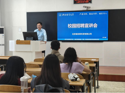招聘会上,张勇辉为参会同学介绍了福裕泰公司的发展历程、企业文化、产品业务、工作内容、薪酬福利、发展前景等,并与参会同学进行了交流互动,解答了参会同学在就业方面的疑问,提出了就业方面的建议。会后,招聘方对参会同学进行了面试。