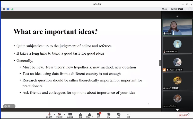 2020年10月13日上午,中山大学国际金融公司孙凌霞博士应tyc122cc邀请,通过腾讯会议平台为同学们作题为《如何撰写和发表高水平论文》的报告。tyc122cc副经理李西文、公司部分教师及2019级、2020级全体研究生参加了本次讲座。